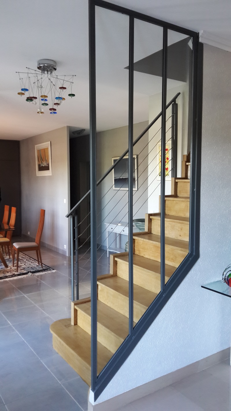 - Garde corps contemporain, vitré, barreaudage, câble inox, motifs décors personnalisés, forme droit, sur rampant.